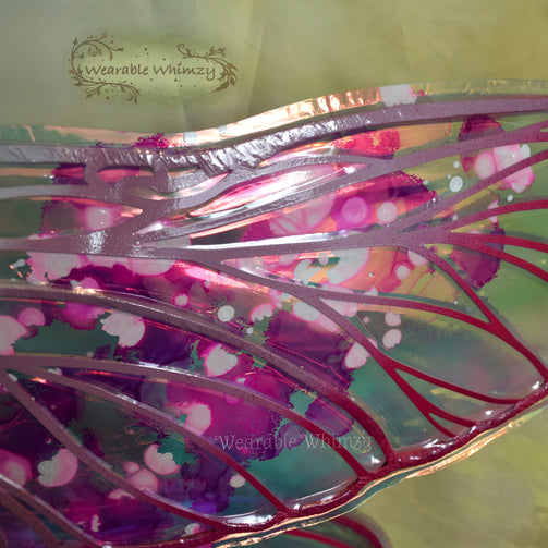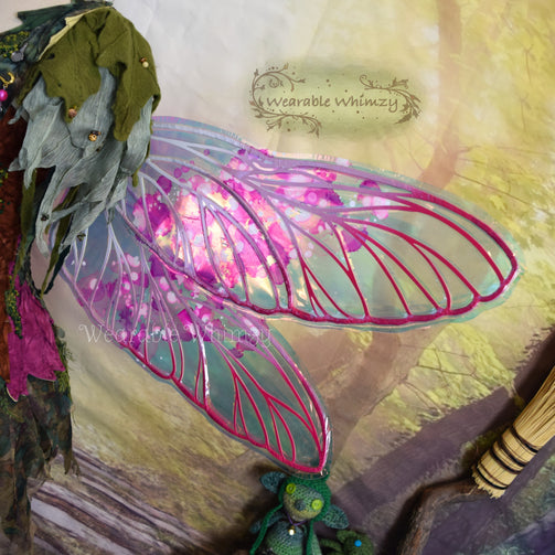 A fantasy twist on a classic insect wing. These buzzing beauties feature 4 panels! The pictured set was made in ombre white/powder puff/bubblegum dura-veining, and skinned in my Fairy Floss iridescent film! Mottled inking in bubblegum/candy/white has been applied to the centers for a dapple of sweetness! Be sugary sweet in this set of wings perfect for any buggy fae. You will receive these exact wings!