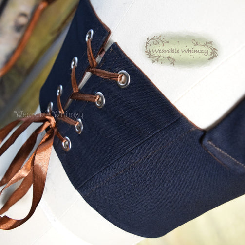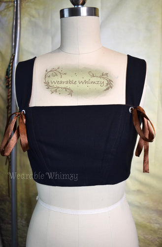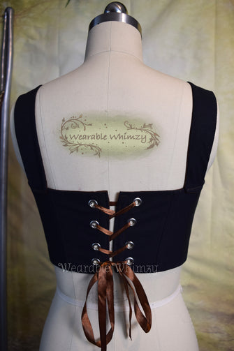 This little corset is made in 100% cotton black duck cloth lining, and chocolate outer. Technically reversible, if you don't mind seeing the boning channels from the black side! Adjustable straps help you customize the fit. Spiral steel boned at all seams and back lacing! A great little layering piece, or something to craft and embellish yourself! The possibilities are endless! 32" bust, but can fit a few inches larger if you don't mind a gap in the lacing! Also adequate for wing wearing!