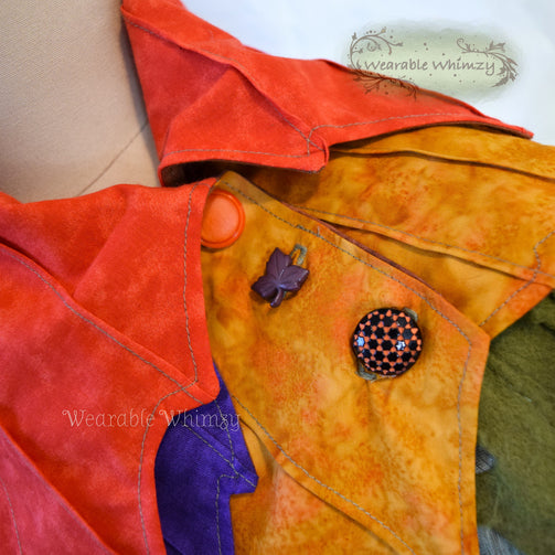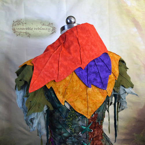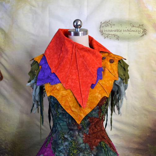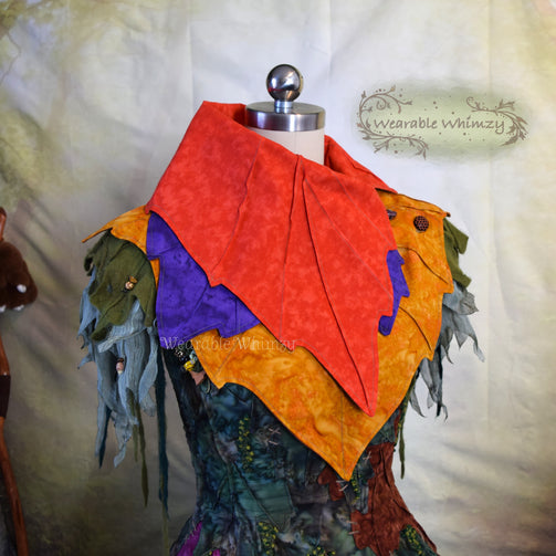 This cowl was made in shades of marigold, violet, and pumpkin cotton, and lined in mismatched remnants of cotton fabrics I had on hand. The pieces have been "veined" in my signature style to give the impression that this cowl was made by a fairy in need of clothes. The asymmetrical neck portion adds a touch of wild flair. Mismatched thrifted buttons form the closure at one shoulder. This can be worn with wings as well!