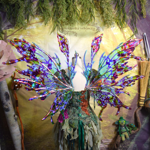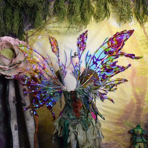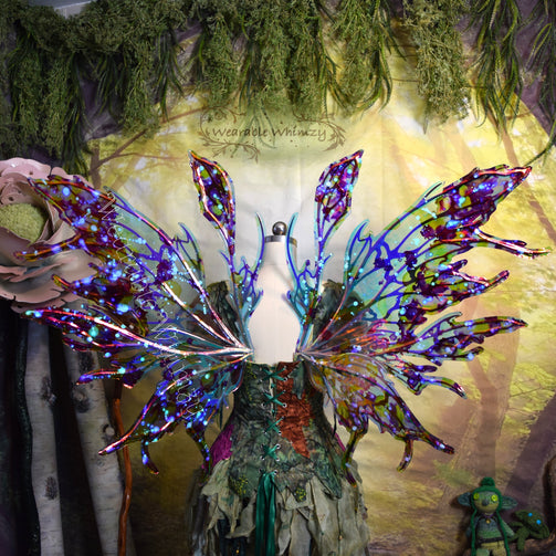 Each pair of wings is made from start to finish in my home workshop! The frames are made with light and durable plastic, and are supported in my signature Dura-wing method! A rigid wire frame encases the majority of the outer edges of each panel at major points of potential impact. Larger panels may also have an extra inner support wire or two! My Dura-wing method ensures even more warp resistance to sideways impacts and drags! Iridescent film is applied and reinforced with vinyl to make them tear and puncture resistant! They are light weight and bounce and flutter gently with your body to create life-like wonder! They are also water resistant, so don’t worry about running to hide when it rains!
