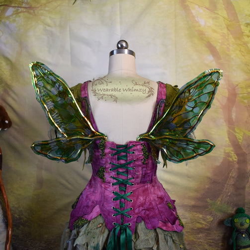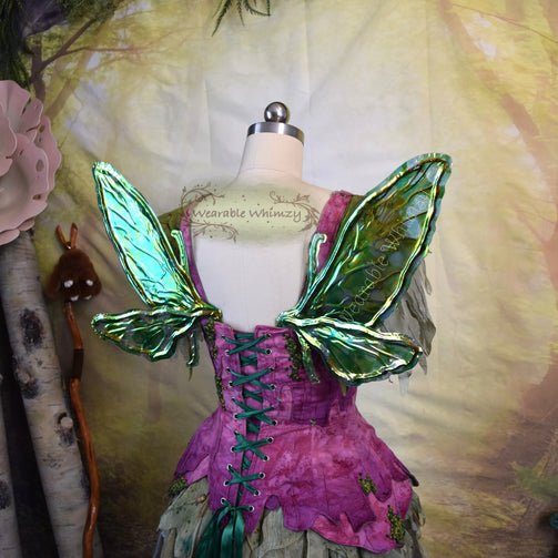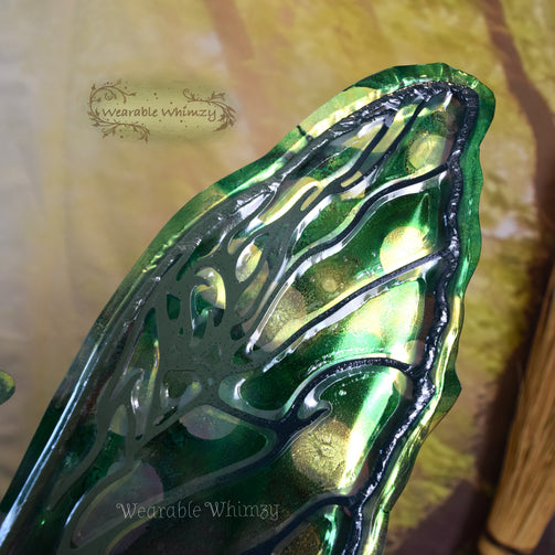 Introducing a teeny version of my Scarab wing design! These buzzing cuties feature 4 panels! The pictured set was made in ombre green veining, and skinned in my Mantis iridescent film! Mottled inking in shades of green as well as flecks of Dragon Scale has been applied throughout to mimic vibrance of jewel beetles. Be the pop of color on the leaves in this set of wings perfect for any buggy fae. You will receive these exact wings!