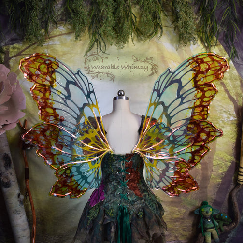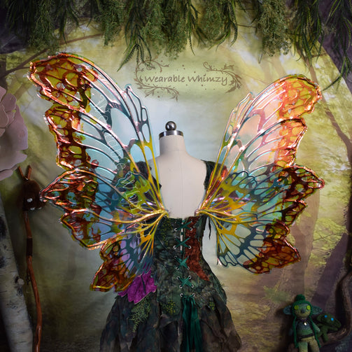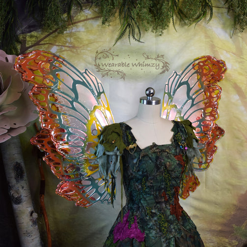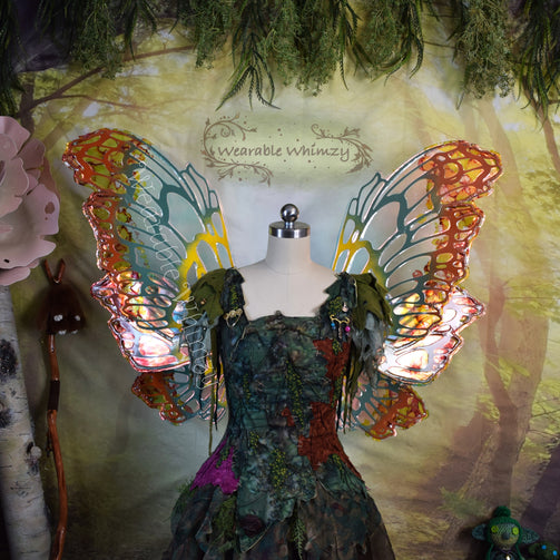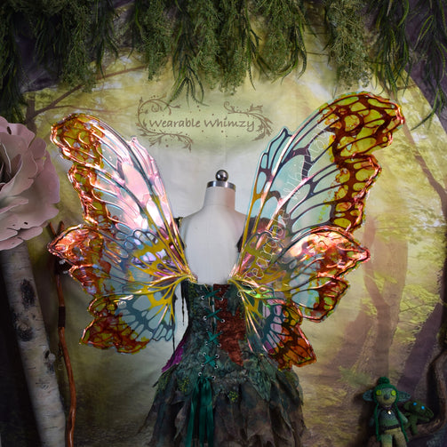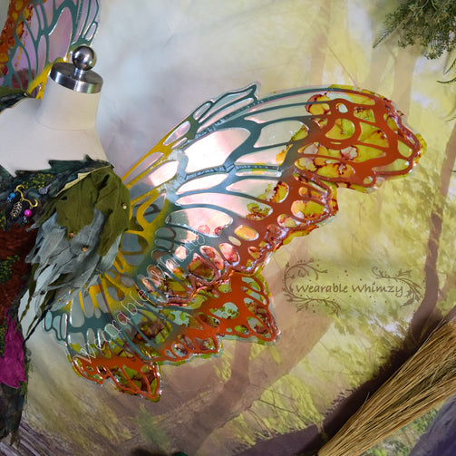 Introducing the Frill wings! These layered beauties feature 6 panels! The pictured set was made in ombre marigold/moss/pumpkin dura-veining, and skinned in my Fairy Floss iridescent film! Mottled inking in cranberry/kiwi/Blaze/sunflower has been dappled along the edges for an extra bluster of Autumn coziness! Be the crisp cool breeze in this set of wings perfect for any Autumn fae. You will receive these exact wings!