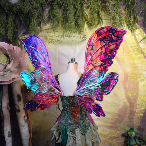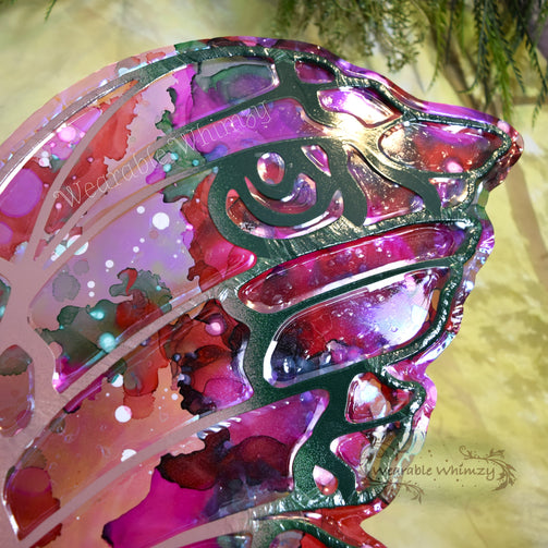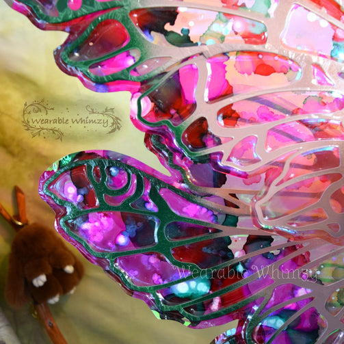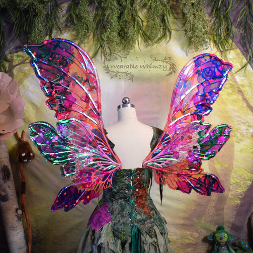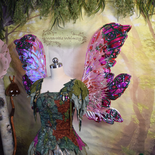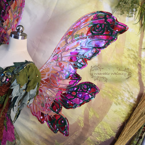 Introducing the Jester wings! These layered beauties feature 6 panels! The pictured set was made in ombre powder puff/mauve/pine dura-veining, and skinned in a combo of my Snapdragon and Fairy Floss iridescent film! Mottled inking in spruce/raspberry/bubblegum/white has been applied to the edges for an extra dalliance of delight! Be the prettiest flower of the filed in this set of wings perfect for any flower fae. You will receive these exact wings!