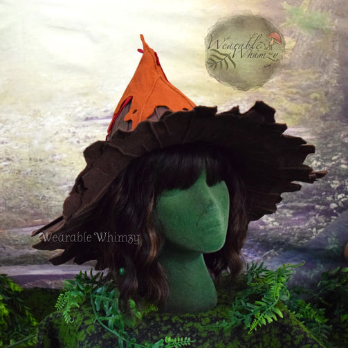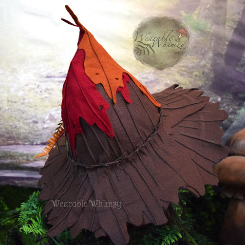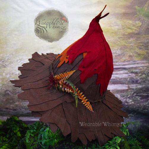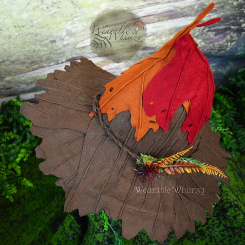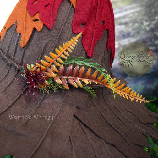 Re-introducing my felt fairy hats! This cute woodland hat was made on a base hat! "Ridged" pieces of felt tree bark in a lovely chocolate brown have been pieced together to create this hat. "Veined" felt leaves in red and orange were applied to the tip for extra woodland flair. A twisting accent fine dances around the band, while sprouts of ferns, moss and a thistle perch on one side, creating a focal piece. Each element gives the appearance that this hat was crafted from items foraged from the forest floor! It has a wide(5"-6"), mildly posable brim, perfect for days out in the forest. I can personally vouch for its sun protection!