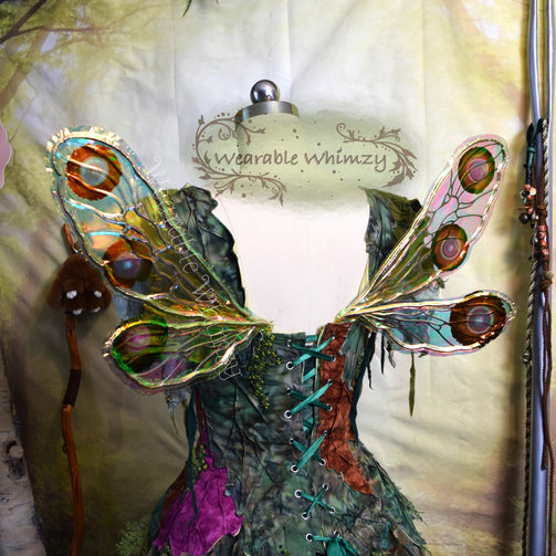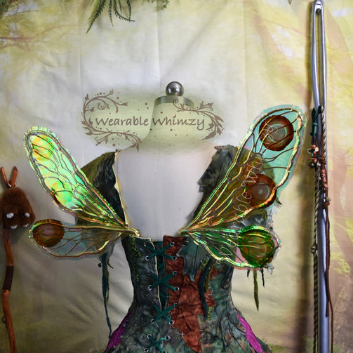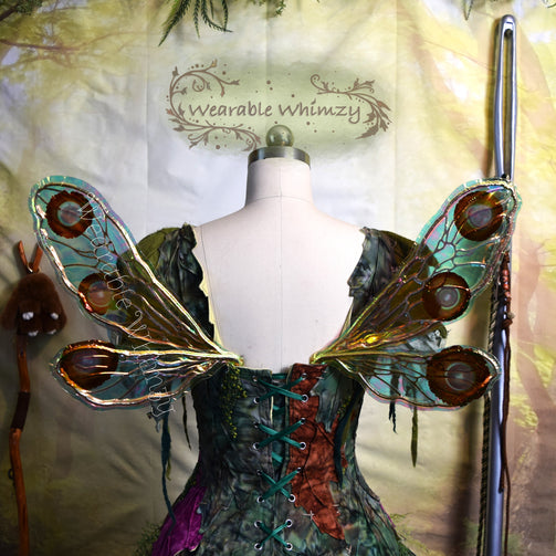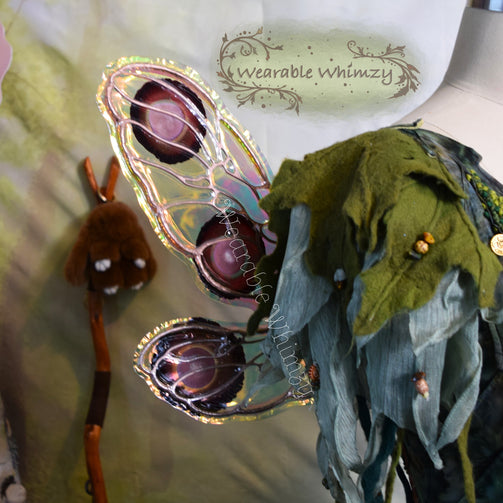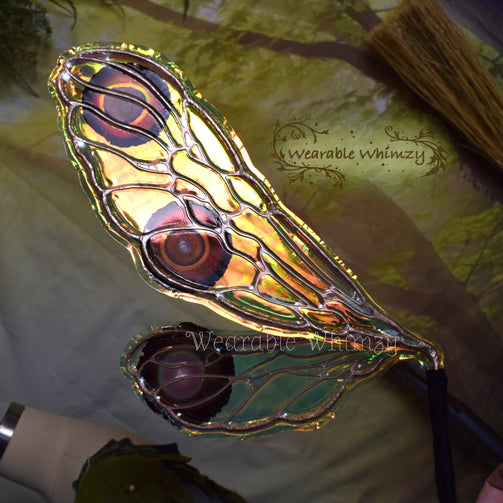 Introducing the small sized Bumble wings! These simple, fluttery beauties feature 4 panels! The pictured set was made in copper dura-veining, and skinned in my Sunshine Yellow iridescent film! Ink "eyes" in cocoa and white has been applied to the edges for a dapple of forest magic! Be the buzz of the bees in this set of wings perfect for any buggy forest fae! You will receive these exact wings!