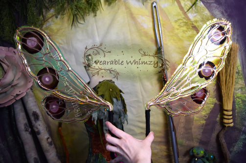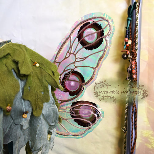 Each pair of wings is made from start to finish in my home workshop! The frames are made with light and durable plastic, and are supported in my signature Dura-wing method! A rigid wire frame encases the majority of the outer edges of each panel at major points of potential impact. Larger panels may also have an extra inner support wire or two! My Dura-wing method ensures even more warp resistance to sideways impacts and drags! Iridescent film is applied and reinforced with vinyl to make them tear and puncture resistant! They are light weight and bounce and flutter gently with your body to create life-like wonder! They are also water resistant, so don’t worry about running to hide when it rains!
